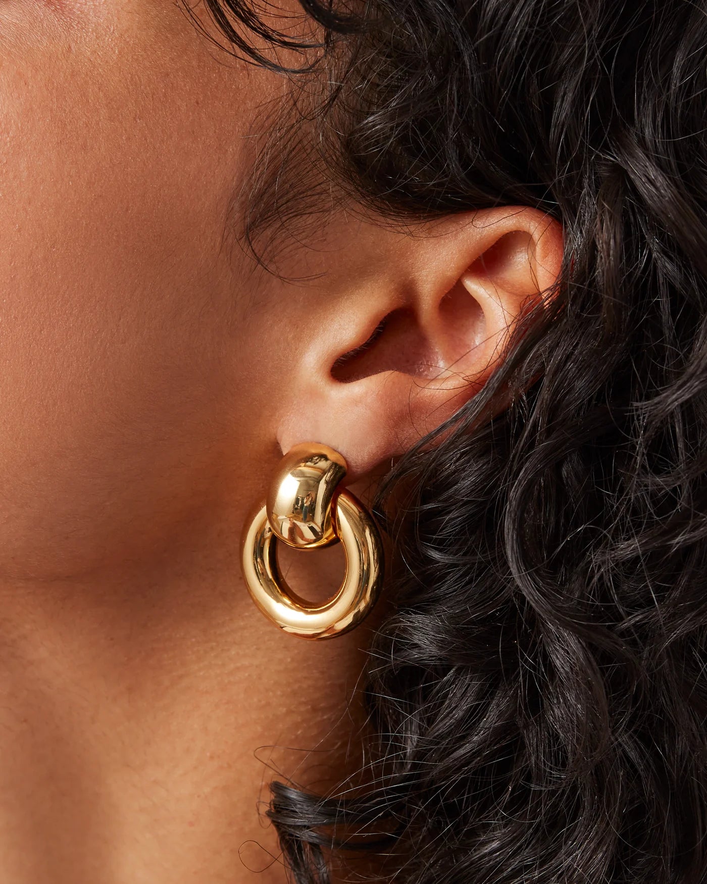 A new take on a classic fave, this hybrid hoop earring was reimagined with a boost in size for extra volume and fun. A chubby high-shine hoop swings from a gleaming huggie earring, creating beautiful movement as you wear them. Finished in high-polish gold.