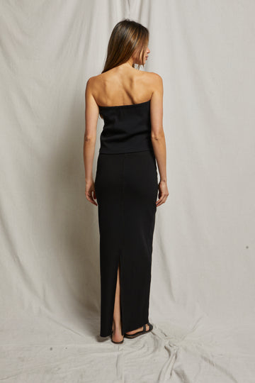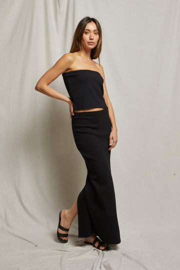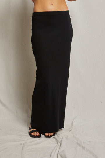 sleek and form fitting, this is the skirt of the season. crafted in our bestselling rib blondie fabric, this full length maxi skirt hugs curves while having just the right amount of stretch. features a center back slit for movement.