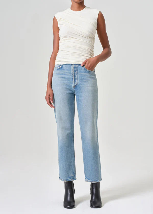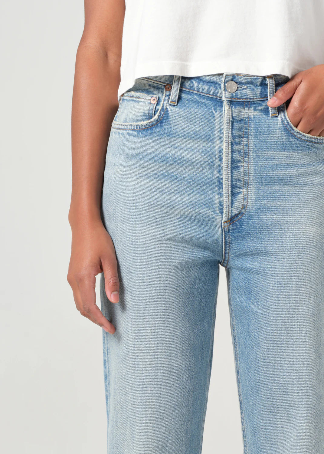 If you love the Riley, you will love our 90's Pinch Waist Crop. It inspired by two of our best-selling styles. Featuring a flattering high-rise waist with a close-fitting top block through the hips, an easy, classic straight leg finished with a cropped inseam.