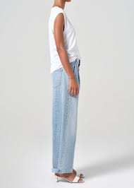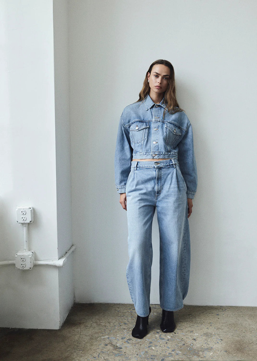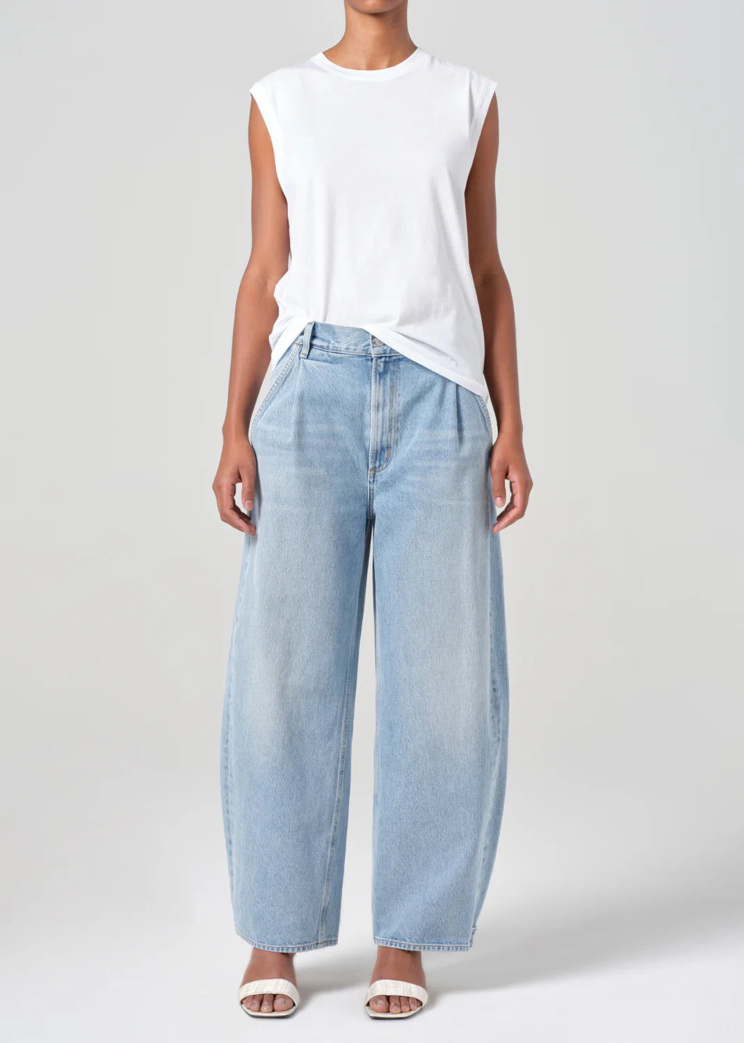 Trouser inspired denim with pleat detailing and snap closures at the ankle.