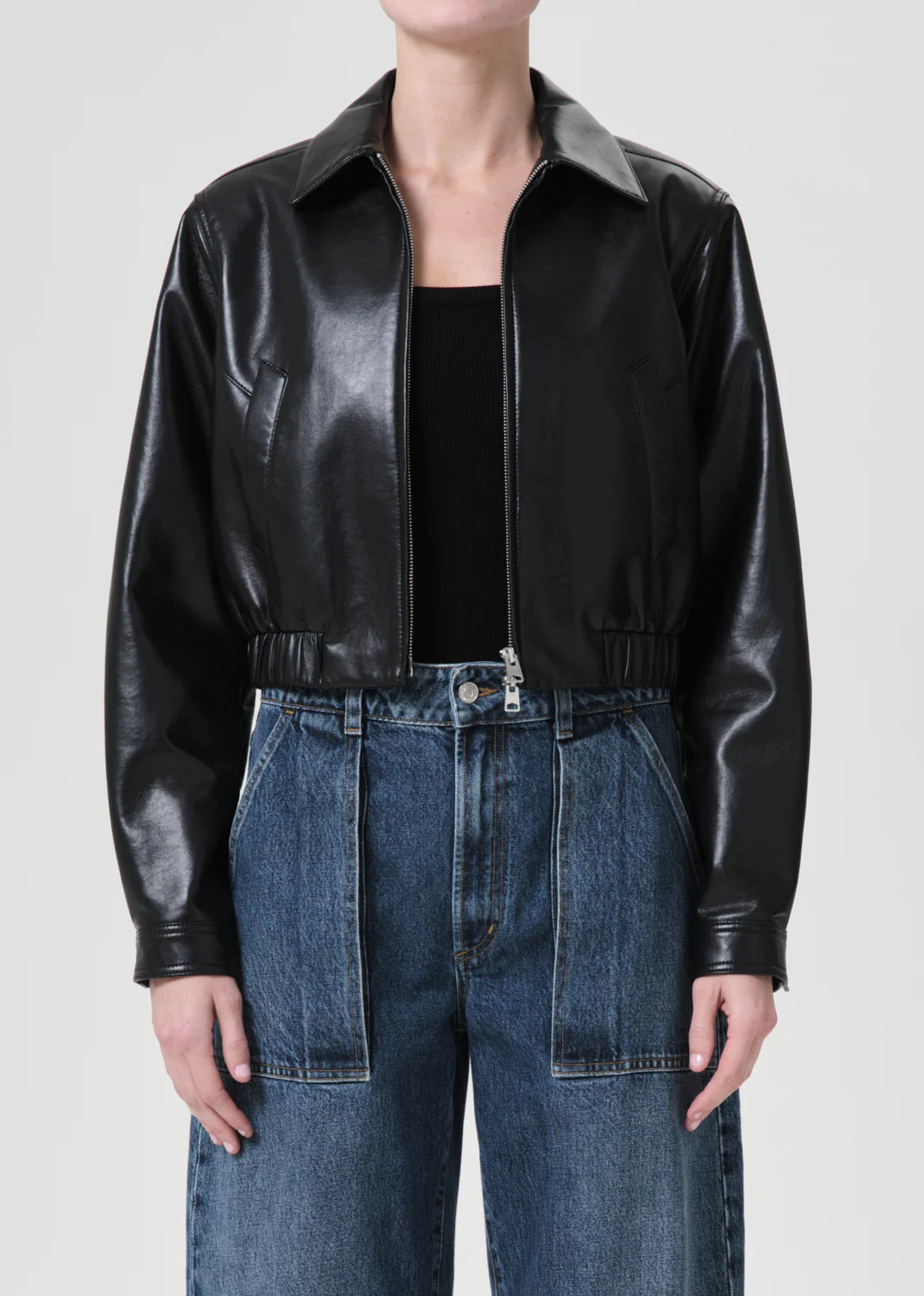 Looks Like: Clean black cropped leather jacket