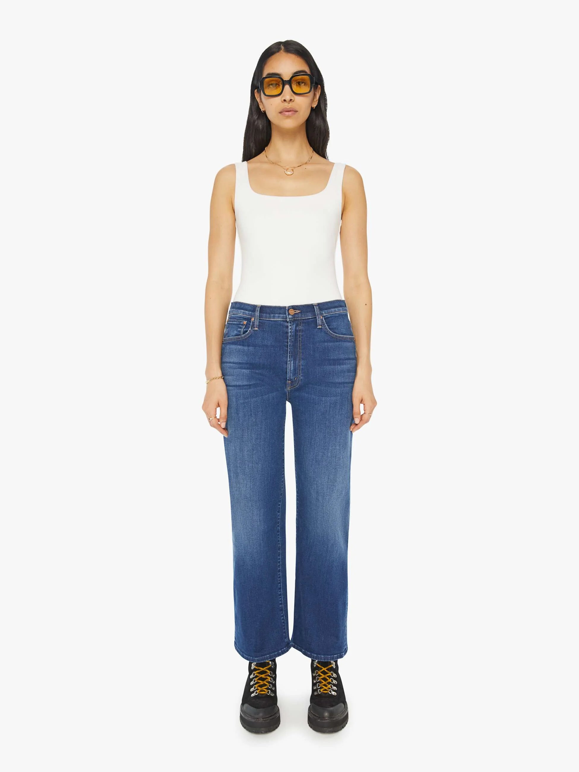 Over your shoulder. Jeans designed to sit lower on the hips with a loose straight leg and an ankle-length inseam. Made from stretch denim, On Your Left is a mid-blue wash with whiskering and fading at the knees.